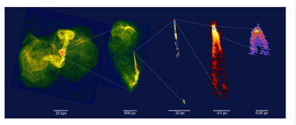 في بعض الأحيان ، عندما تنجذب المادة نحو الثقب الأسود ، فإنها ترتد عن أفق الحدث وتُقذف إلى الخارج ، بدلاً من أن تُسحب للداخل. يتم تشكّل نفاثات ساطعة من المواد المتأينة تتحرك بسرعات شبه نسبية (قريبة من سرعة الضوء). على الرغم من أن الثقب الأسود لا يزال غير مرئي، فيمكن رؤية هذه النفاثات القوية من مسافات بعيدة. كانت صورة Event Horizon Telescope للثقب الأسود في مركز المجرة M87 (تم إصدارها في عام 2019) جهدًا غير عادي، وتطلبت عامين من البحث حتى بعد التقاط الصور. هذا لأن التعاون بين التلسكوبات، والذي يمتد عبر العديد من المراصد في جميع أنحاء العالم، ينتج كمية مذهلة من البيانات أكبر من أن يتم نقلها عبر الإنترنت. |