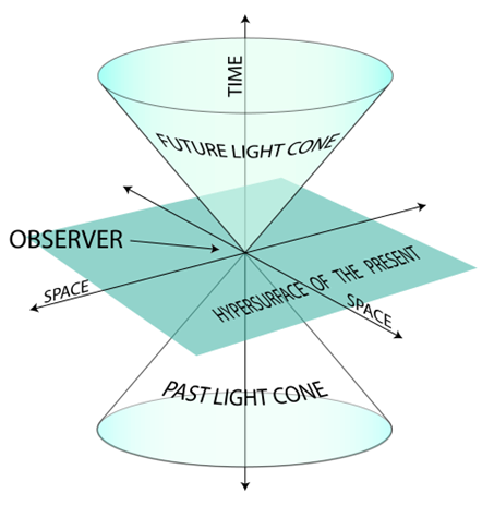 الراصد (observer) عند نقطة الأصل يرى من الكون فقط الجزء الواقع في ماضي مخروطه الضوئي (past light cone). بينما هو يستطيع أن يوصل رسالة للمجرات داخل مستقبل مخروطه الضوئي ( future light cone). |