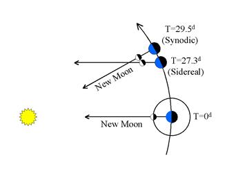 Figure 2 : The Moon & Earth must move together for an extra 2.2 days to re-align with the Sun.( http://www.astronomy.ohio-state.edu/~pogge/Ast161/Unit2/phases.html#lunation) |