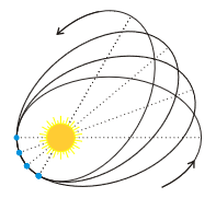 As seen from the orbiting Earth, the Sun appears to move with respect to the fixed stars, and the ecliptic is the yearly path the Sun follows on the celestial sphere. This process repeats itself in a cycle lasting a little over 365 days. ([15]) |