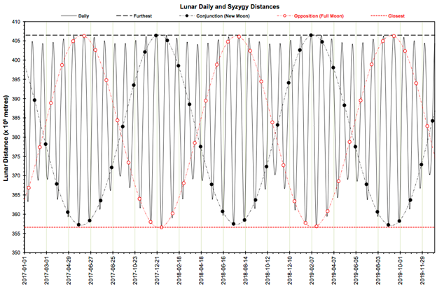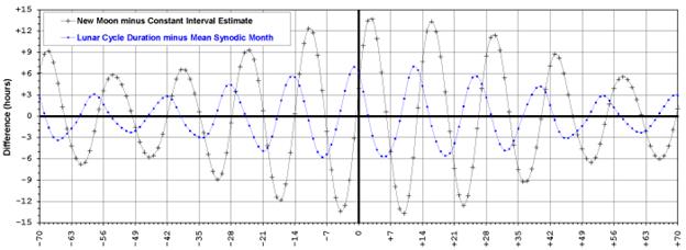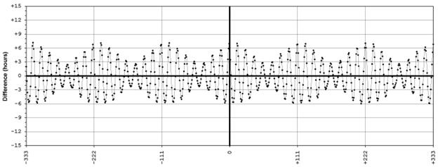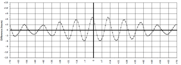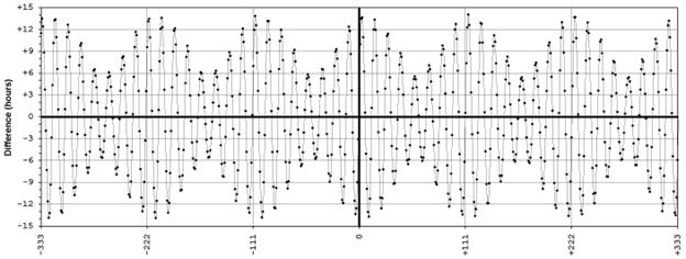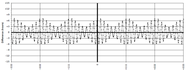 The next chart takes a closer view at the periodic variations by zooming into ±333 lunations relative to the January 2000 epoch ([20]): |