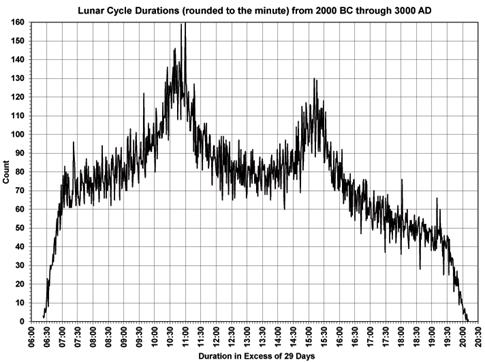 Short-Term Periodic Variations of the Lunar Cycle ([18])In the present era the median ([19]) length of the lunar cycle is about 29d 12h 30m, the average (MSM: mean synodic month) is slightly more than 29d 12h 44m, the shortest lunations are about 29d 6h 30m, and the longest are about 29d 20h. Thus the length of the synodic month varies over a range spanning about 13h 30m. These variations were greater in the past and will diminish in the future: The longest lunar cycles occur when Moon is moving slowest (near apogee) and Earth is moving fastest (near perihelion). The shortest lunar cycles occur when Moon is moving fastest (near perigee) and Earth is moving slowest (near aphelion). The declining mean Earth orbital eccentricity tends to reduce the range of lunar cycle variations. The average lunar cycle (mean synodic month) has miniscule long-term change compared to short-term periodic variations. |