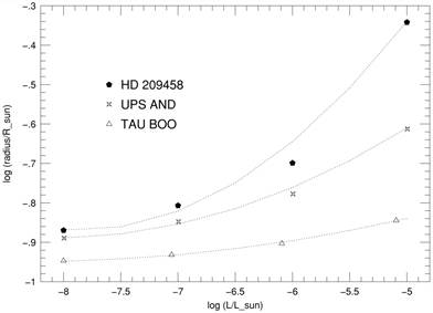 Fig. 1: Radius of planet (in solar units) as a function of dissipation rate (in solar units) for the companions of HD 209458 (filled pentagons), UPS AND (four-pointed stars), and TAU BOO (Open triangles). Dashed lines: quadratic fits. الشكل (1): يوضح أن الكواكب تنتفخ وتزداد حجومها أو أنصاف أقطارها مع زيادة الطاقة التي تستقبلها من النجم؛ أنظر صعود المنحنيات عند الإنتقال من الزاوية السفلية في يسار الشكل إلى الزاوية العلوية جهة اليمين. يعطي ذلك تصورا عن انتفاخ الأرض يوم القيامة حيث ستقترب من الشمس. |