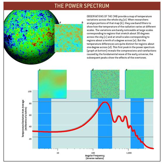 شكل: النمذجة والنسق (Pattern) للمناطق الحارّة والباردة الذي أحدثته الأمواج الصوتية تجسّد كتغاير طفيف في درجة حرارة إشعاع الخلفيّة الكوني CMB.